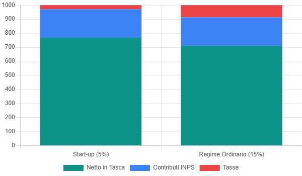 Vediamo l’impatto fiscale su una fattura di 1.000€, confrontando un SMM in fase di start-up (tasse al 5%) rispetto ad uno a regime (tasse al 15%).