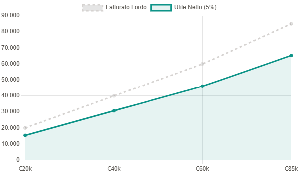 Come scala il tuo reddito all’aumentare del fatturato? Visualizziamo la differenza tra il lordo fatturato e il netto in tasca (tasse 5%).